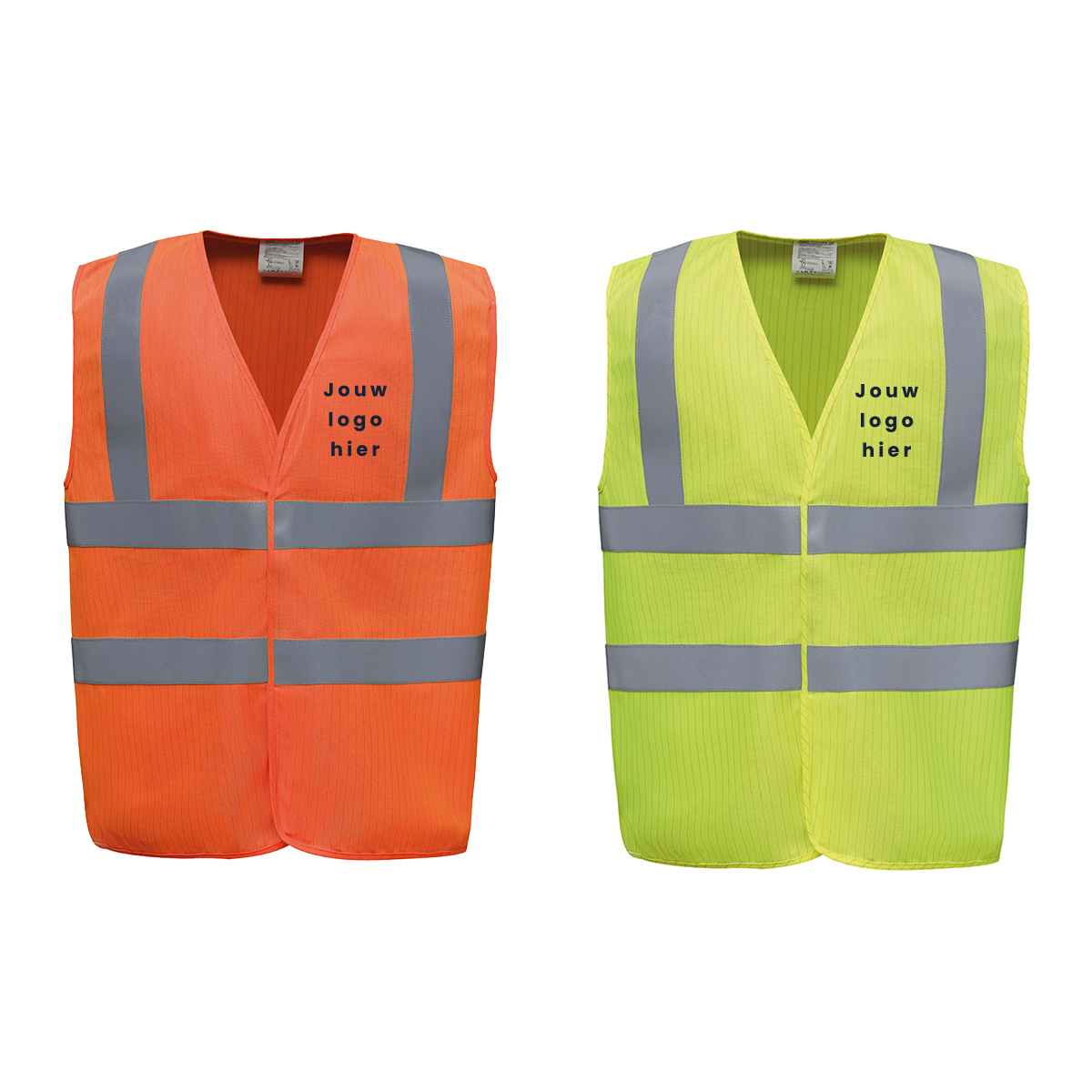 Antistatische en vlam vertragende veiligheidsvesten bedrukken met eigen logo, afbeelding en/of teksten? Deze gele en oranje veiligheidshesjes hebben twee reflecterende stroken rond het lichaam en één op iedere schouder. De hesjes hebben een klittenbandsluiting en gemaakt van 100% gebreid polyester. Deze hesjes bieden bescherming tegen hitte, vlammen en zijn antistatisch. Bestel de bedrukte vesten hieronder of vraag een offerte op maat aan. Na ontvangst van de bestelling ontvang je heel snel een digitale proefdruk per mail.
