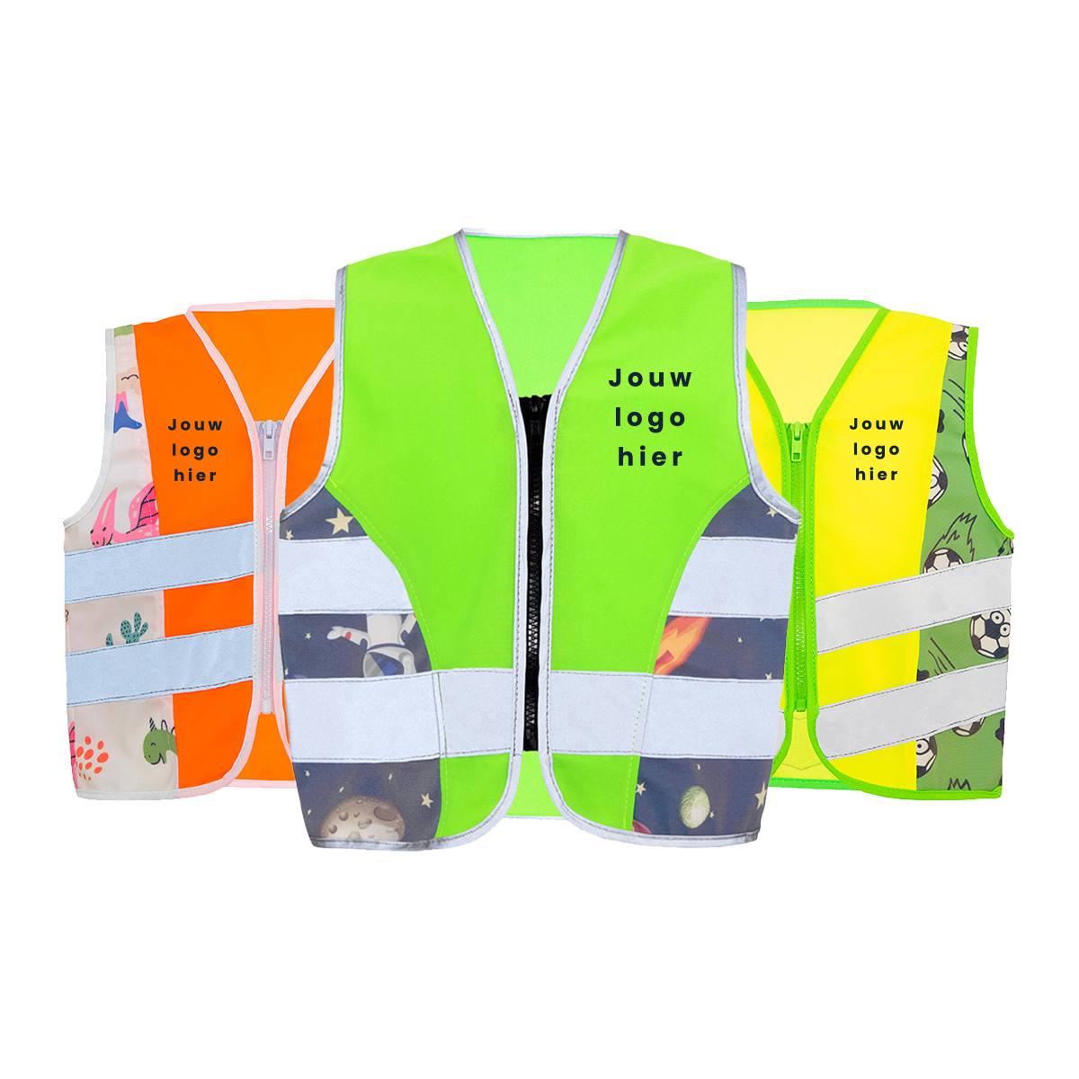 Deze kinder veiligheidsvesten zijn erg uniek en zie je nergens anders. De hesjes hebben een ritssluiting aan de voorzijde en worden als jasje gedragen. Op deze manier kunnen de kinderen de hesjes zelf niet gemakkelijk uit doen tijdens activiteiten of wandelingen. Deze actie hesjes zijn in vijf verschillende modellen te bestellen, in stijl van sport, ufo, alien en dino’s (zowel oranje als geel). Wanneer je kiest voor deze hesjes ben je duurder uit dan de standaard veiligheidsvesten, maar wel zul je erg goed opvallen tijdens activiteiten, schoolreisjes etc.